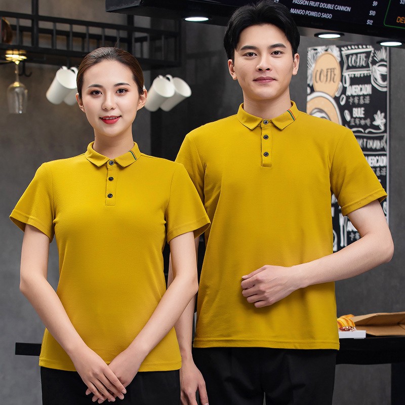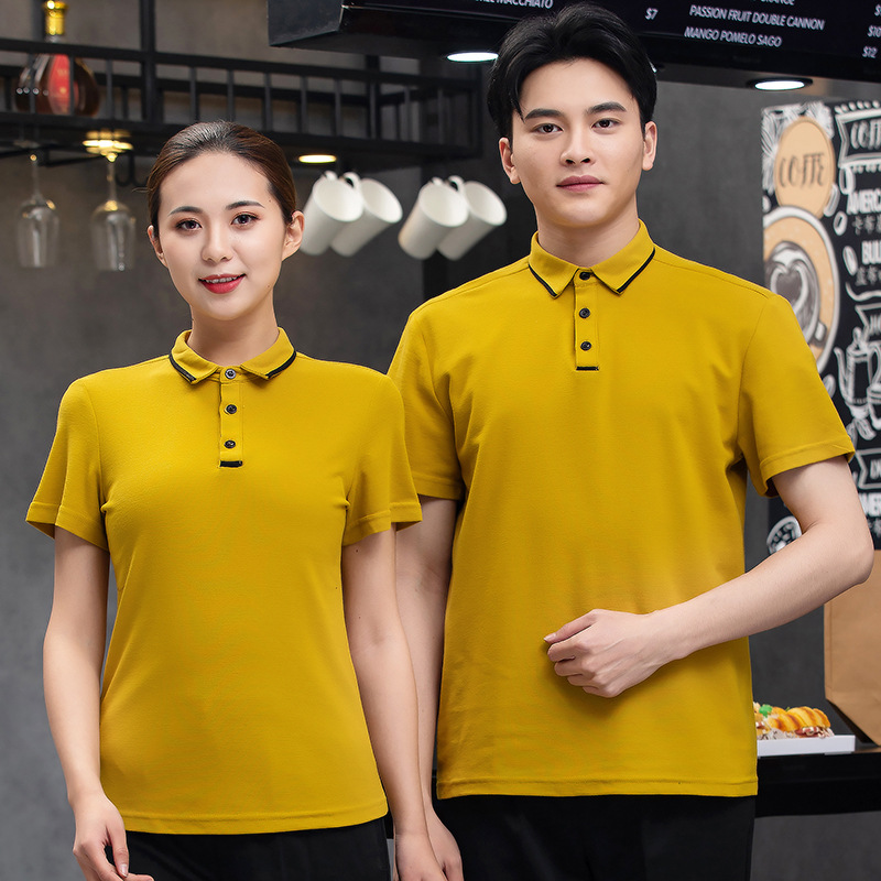 ウェイター作業服半袖カレー色刺繍ロゴホテルファストフード火鍋店綿工装tシャツ夏男さん