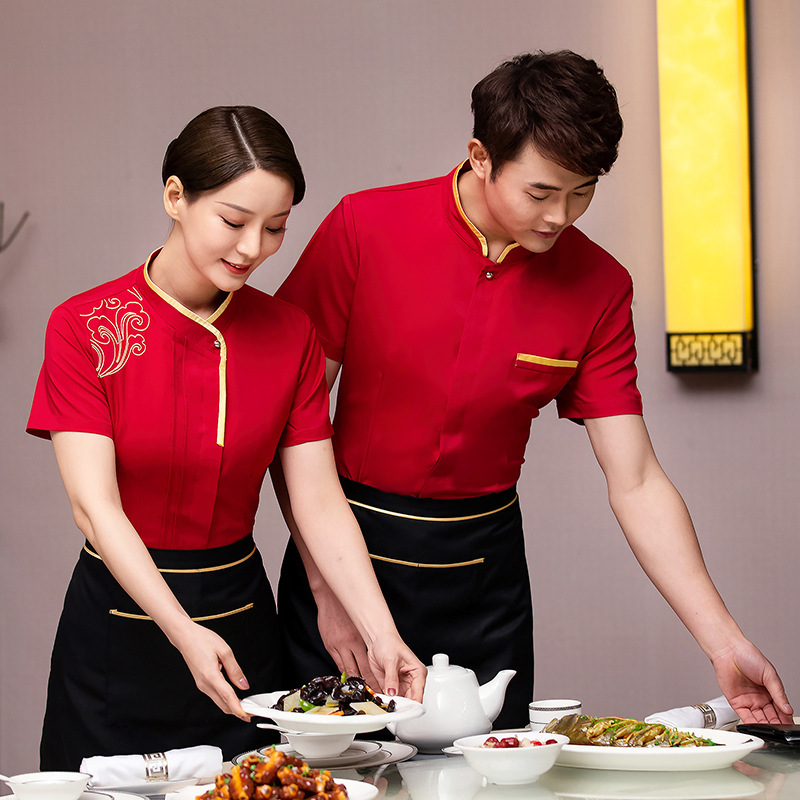 レストランの従業員の作業服の半袖の夏の女性の飲食店のホテルの中華料理の鍋の店の中国式の刺繍の新型