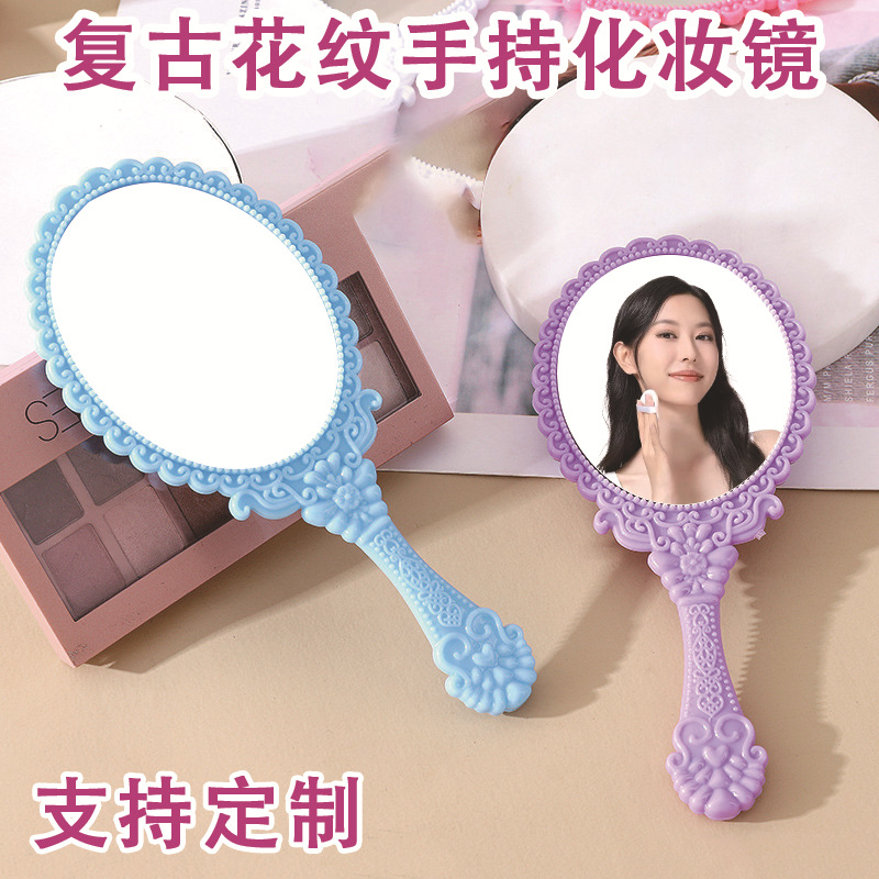高清のプラスチックの取っ手の化粧鏡の韓国式の復古の模様の美容院は携帯して王女を携帯して鏡を持って卸売りします。