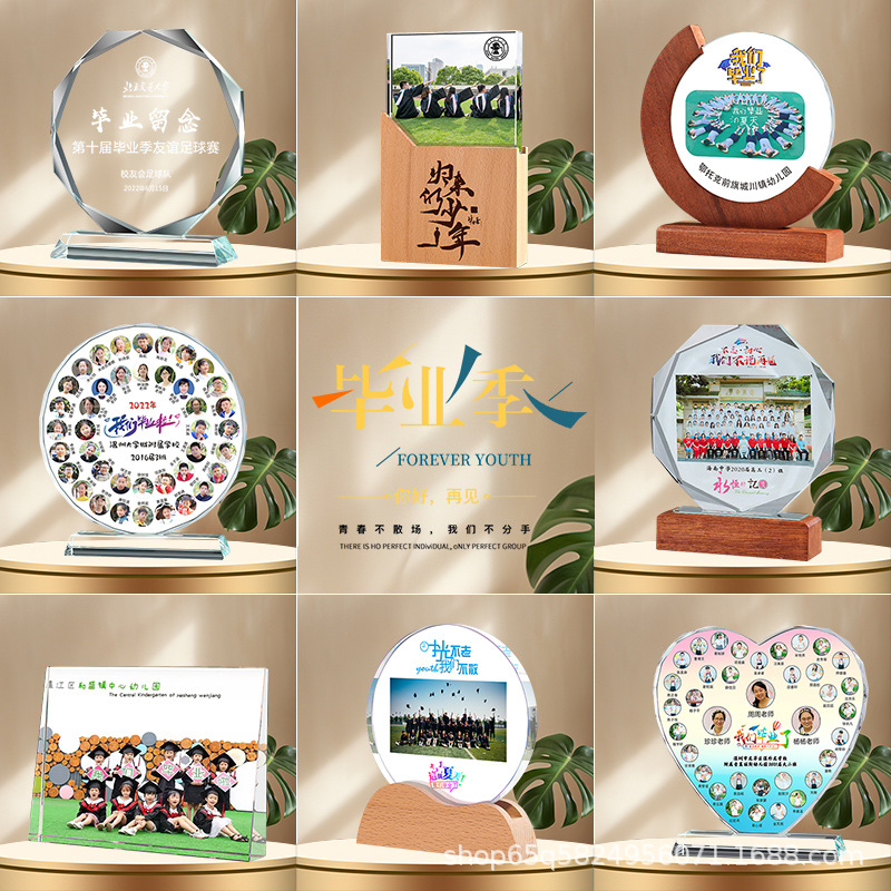 卒業シーズンの学生の集合写真水晶トロフィーは幼稚園の学生の集まりの教師の日の記念の贈り物を注文します。