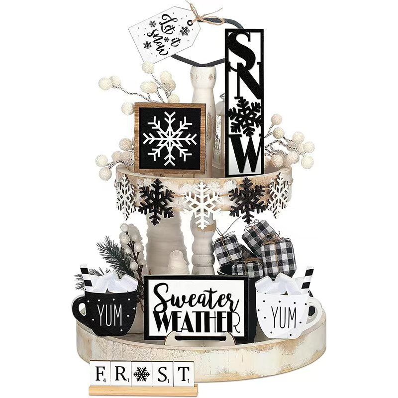 越境冬のクリスマスの雪の標識の層のトレーの木製の置物のアイデアのデスクトップのトレーはクリスマスを飾ります。