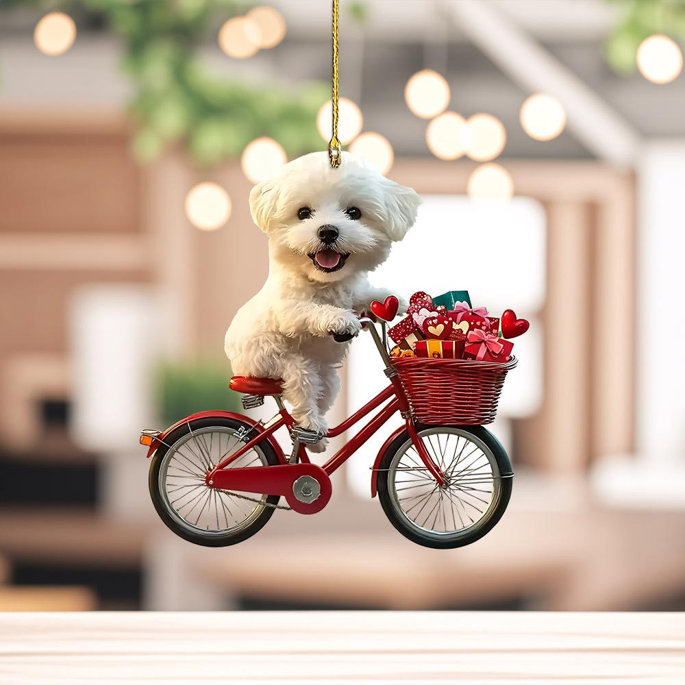 越境バレンタインデー創意バラの子犬動物は自転車の花かごのアクリル飾りのキーホルダーに乗ります。