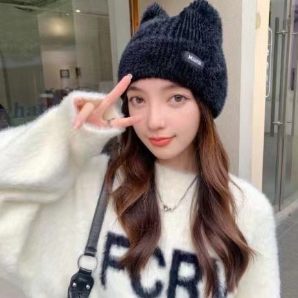 2023新型毛糸帽子子供秋冬日系かわいい猫耳ニット帽のカールが厚くて暖かい帽子をかぶっている