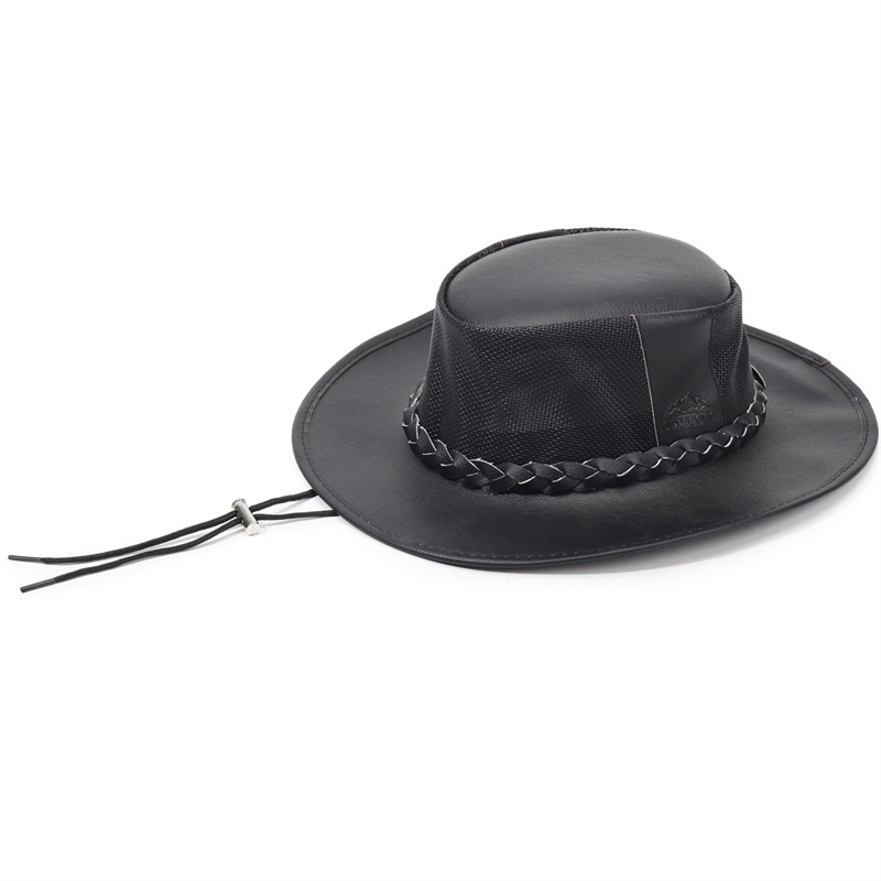 新しいヨーロッパとアメリカのレトロなカウボーイハット、ウエスタンカウボーイの大きなつばのレザー日よけ帽子、クロスボーダー乗馬用日よけ帽子、男性用メッシュ