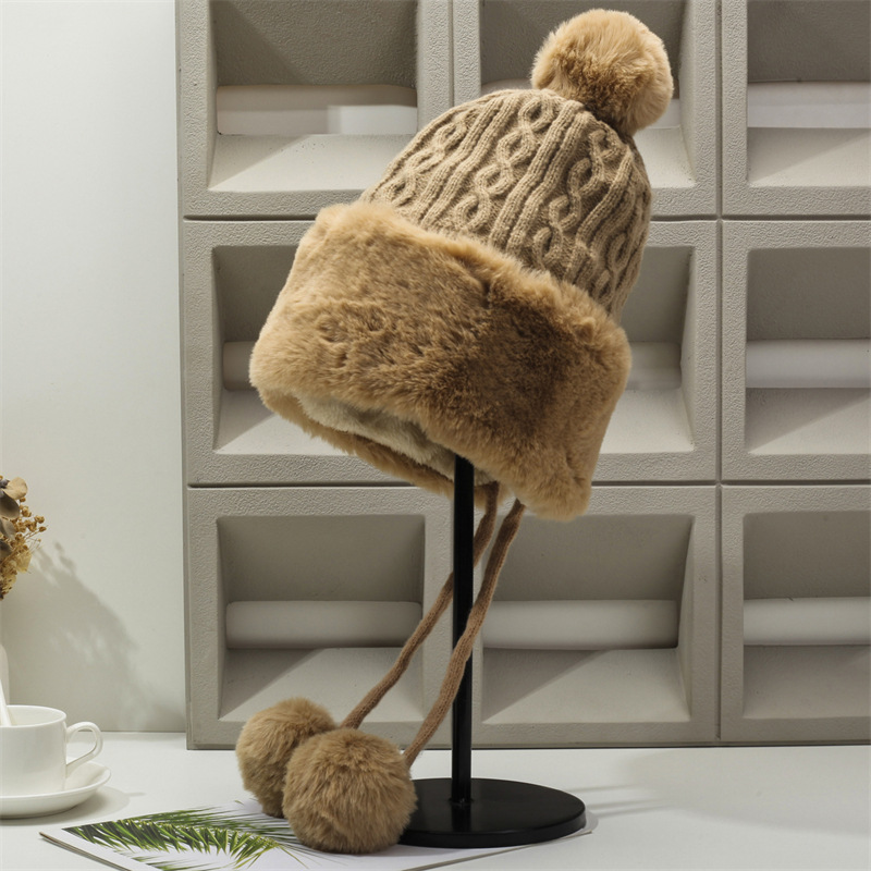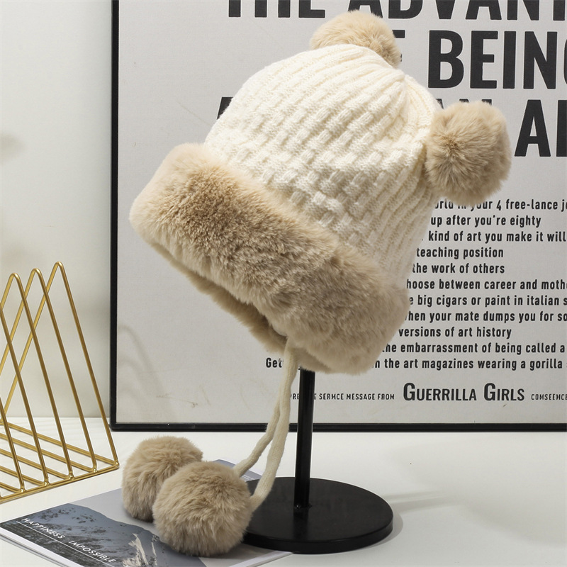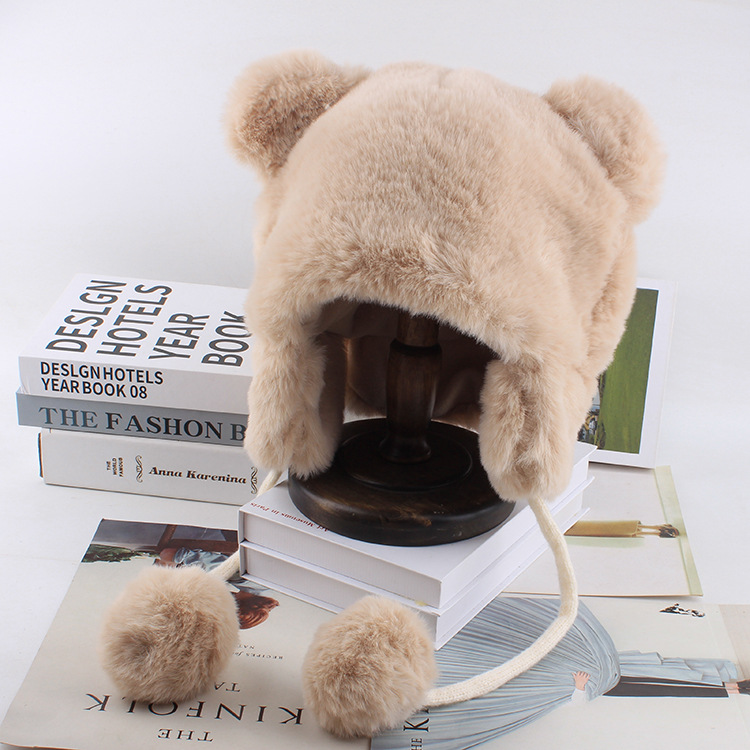 厚い耳保護ニット帽ファッションかわいいぬいぐるみ熊雷鋒帽旅行帽子女性カバー毛糸防寒帽