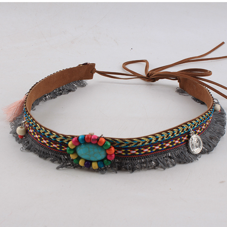 レトロなウエストチェーン付きクロスボーダー帽子、タッセル刺繍付き帽子装飾ベルト、ブラウンPUレザーベルト、牛頭装飾麦わら帽子