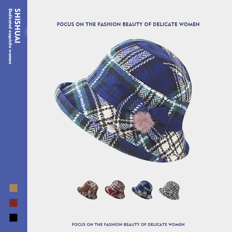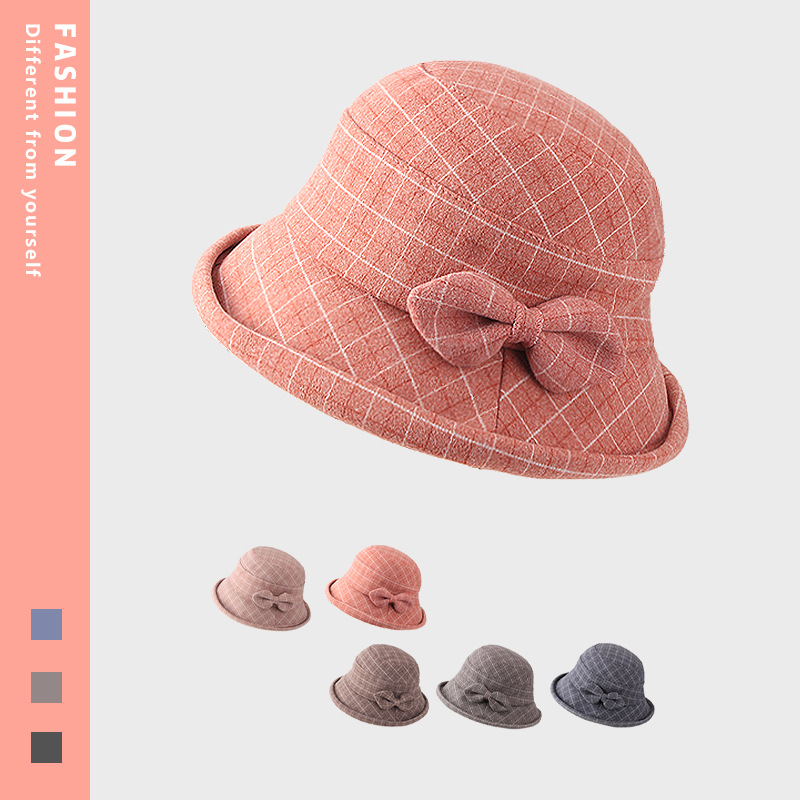 秋冬の女性の帽子は蝶結びの格子に沿って、レトロで暖かい冬の盆栽の帽子のドームの帽子の漁師の帽子に沿っています。