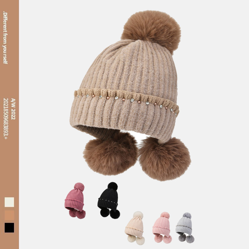 ウサギの毛玉ニット帽の女性は秋冬に耳を保護して、毛糸帽を厚くして、カジュアルな保温帽子がかわいい女性のアヒルの舌を厚くします。