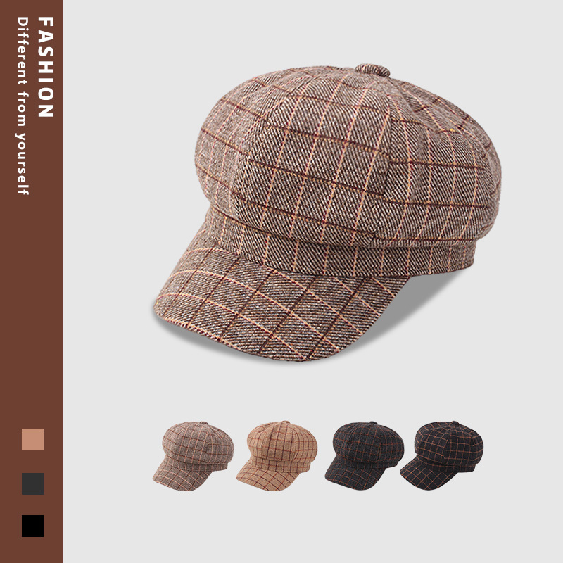 レトロな格子の八角の帽子の女性の格子縞のアヒルの舌の帽子の毛は子供の帽子の秋冬の韓国版のベレーの帽子を報告します。
