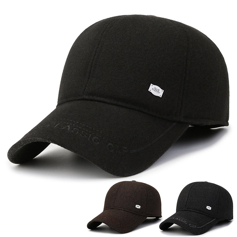 2022新型秋冬鴨舌帽純色ラシャ帯耳保護中高年綿帽おじいさん帽子冬