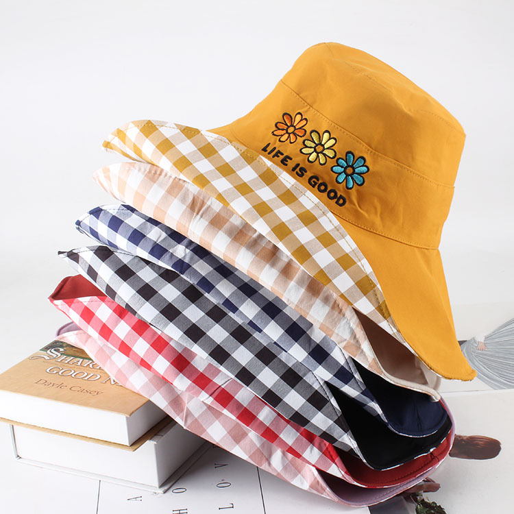 春の夏の女性の帽子韓国のファッションの格子の漁師の帽子の両面は布の帽子の日よけの帽子の日よけの帽子の日焼け止めのビーチの帽子を持ちます。