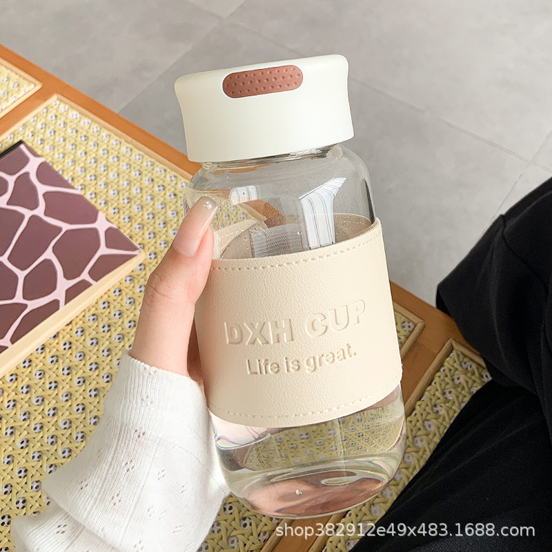 女性用のシンプルなウォーターカップ、見栄えの良いガラスカップ、高温耐性、2025年夏の新スタイル、学生用ポータブルティーセパレーターカップ