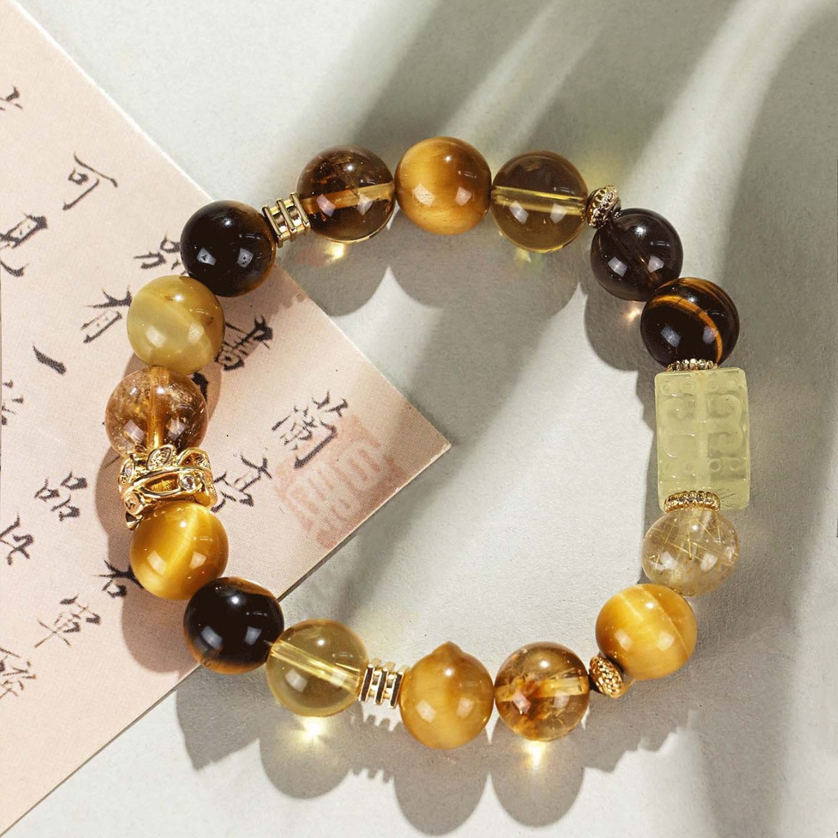 新商品の金色のモザイクの幸運の宝石の手は金色の合金の黄色の虎の目の黄色の水晶の金色の結晶の猫の目の石のブレスレットを結びます。