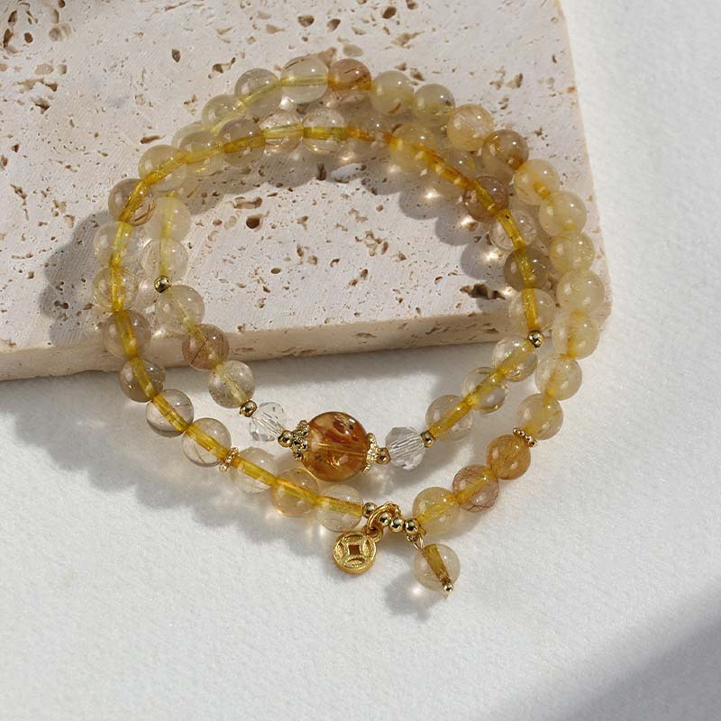 新型天然黄水晶黄発晶ブレスレット小衆爆金水晶デザイン高級感双鎖招財手串