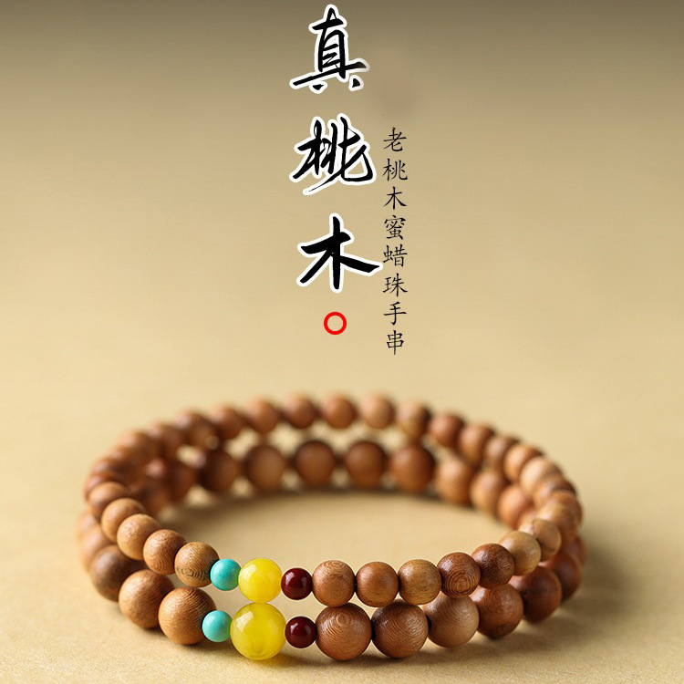 ミツロウの桃の木のブレスレットの女性の新しい中国式の朱砂の回転の玉の数珠の手は国風の文芸の木の松石の手を刺して女性を飾ります。