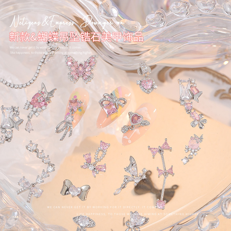 蝶のペンダントネイルアートアクセサリー ピンクの立体的な蝶結び ハート型のキラキラ輝くジルコンネイルアートダイヤモンドアクセサリー インス風