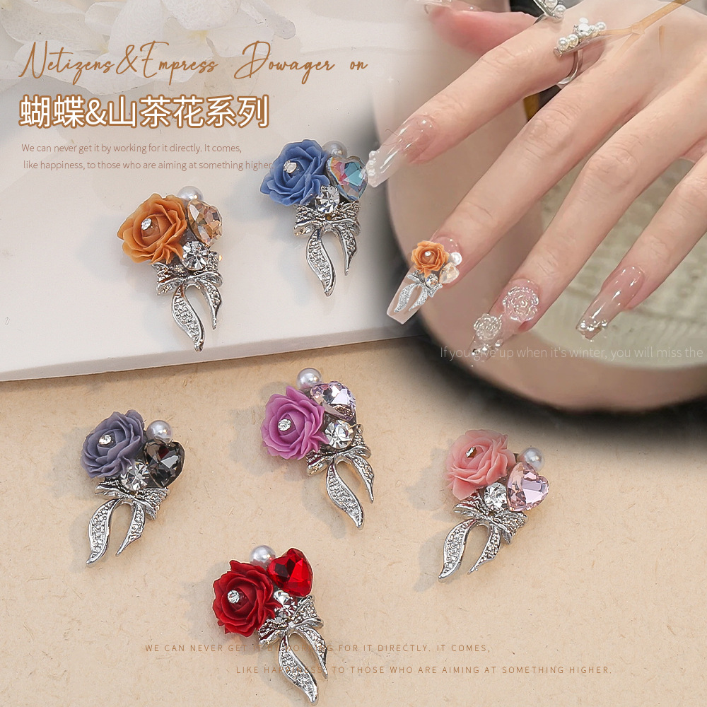 ネットの赤いネイルアクセサリーの蝶結びのツバキの花の桃の心の山のダイヤモンドの美ラードのバラの真珠の合金の爪の装飾