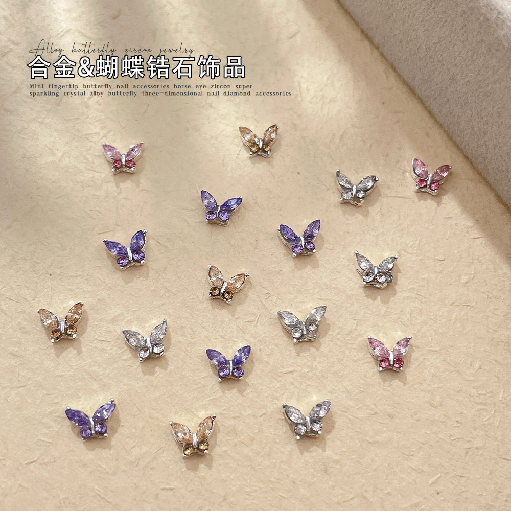 キラキラジルコン蝶ネイルアクセサリー透明ピンク水晶馬眼立体合金小蝶ネイルドリルアクセサリー
