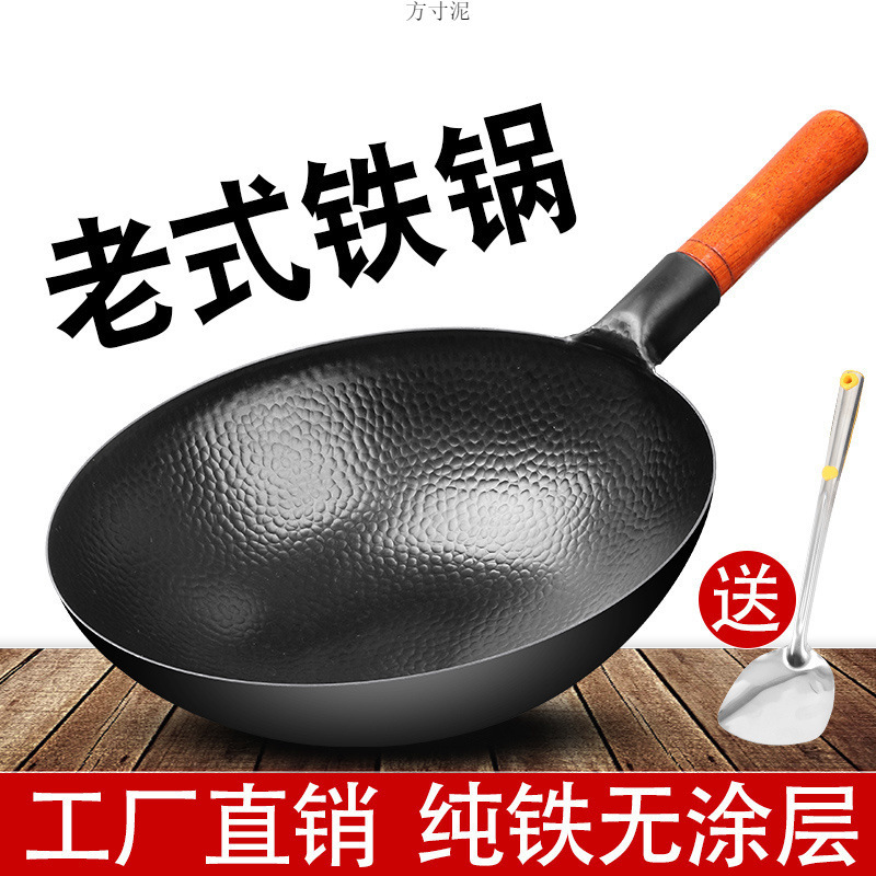 章丘鉄鍋黒鍋は鍋にくっつかない鉄鍋家庭用の古い手作り鍛錬鉄鍋円底源工場で卸売りされている