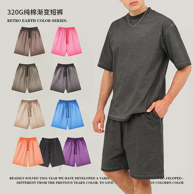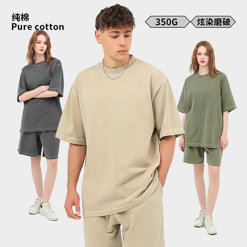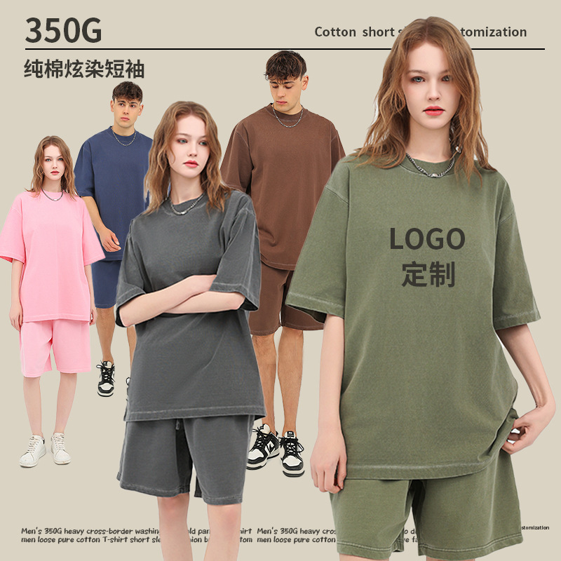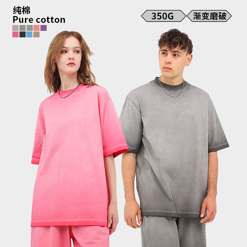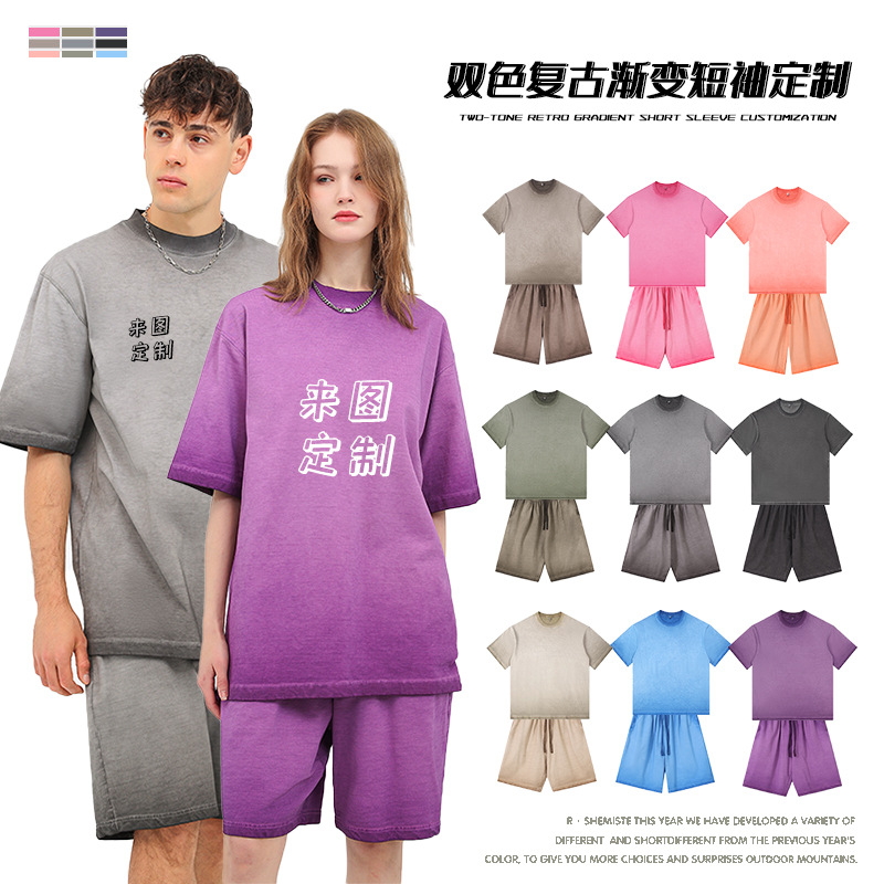 メンズ2025クロスボーダー潮牌グラデーション洗水は古い350G重ポンド純綿ゆるい半袖tシャツセットをカスタマイズします。