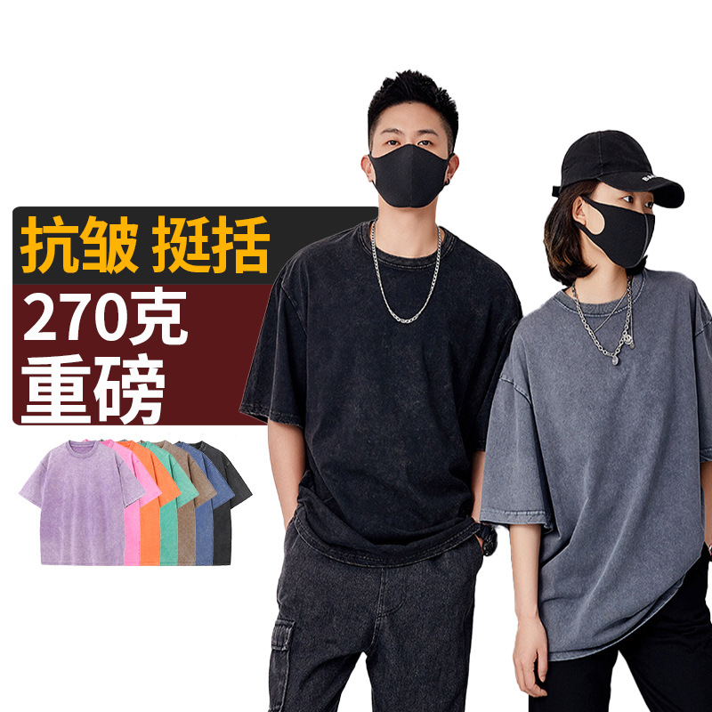 270グラム重ポンド潮牌丸襟半袖純綿水洗いして古い雪花アメリカレトロtシャツカスタムロゴを作る