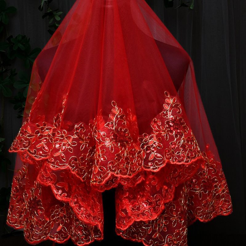 Δ花嫁のウェディングベール、鳳冠霞ペイ、ヒジャブウェディングドレス、中国風レトロ秀和服、半透明の赤いカバー