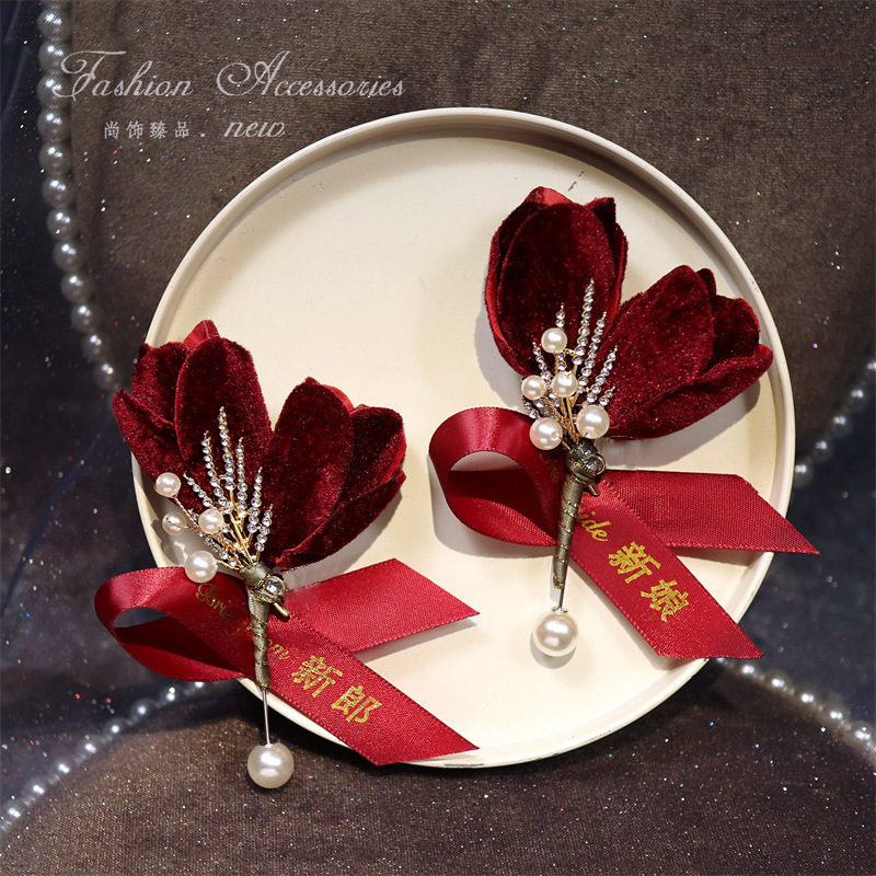レトロなワインの赤いチューリップの結婚の胸の花の家族のフルセットの新郎の新婦の結婚式のブローチの花嫁の装飾品