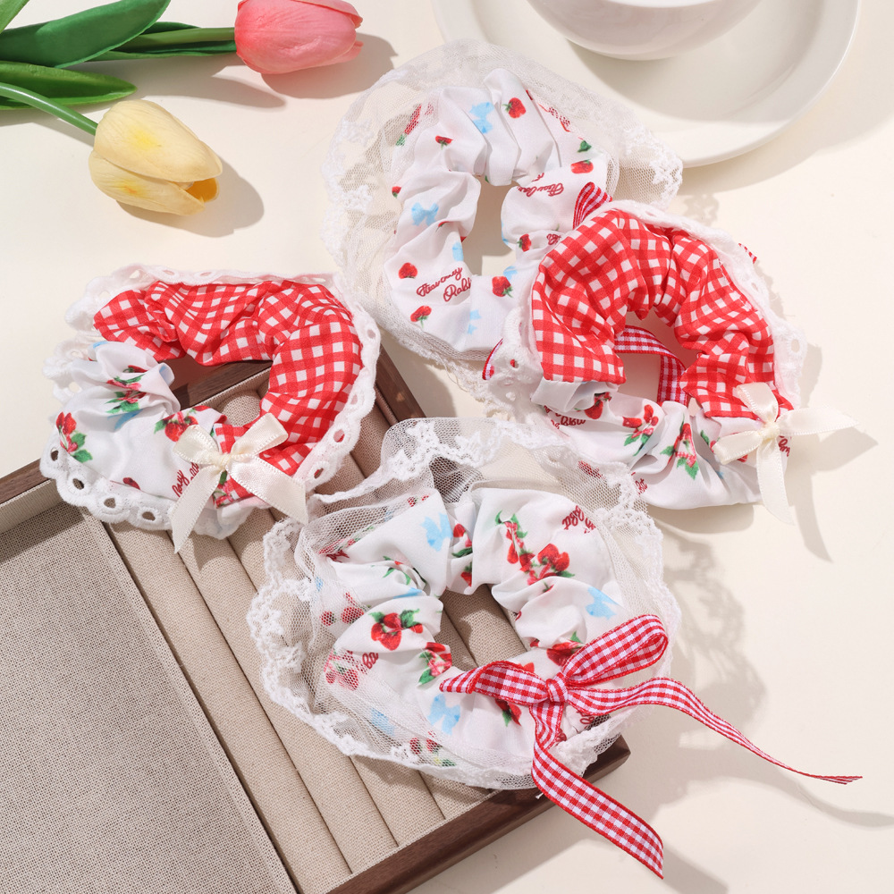 甘い蝶結びレース大腸シュシュ田園風いちご少女高級感大サイズの丸子髪紐