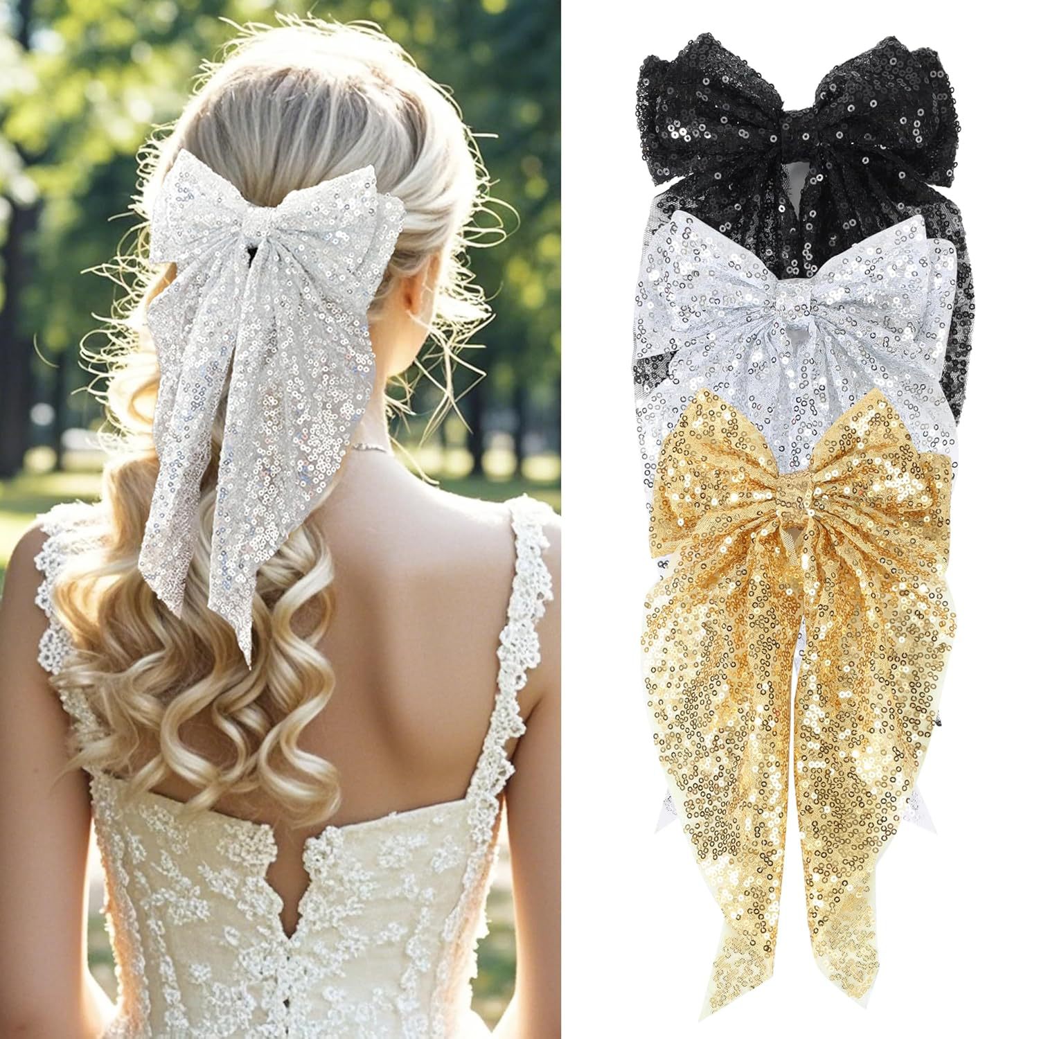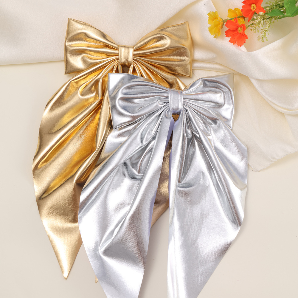 フランス式の優雅な蝶結びのスプリングは金色の銀色の長いリボンのヘアピンの後頭部のヘアピンの祝日のパーティーの髪飾りを挟みます。