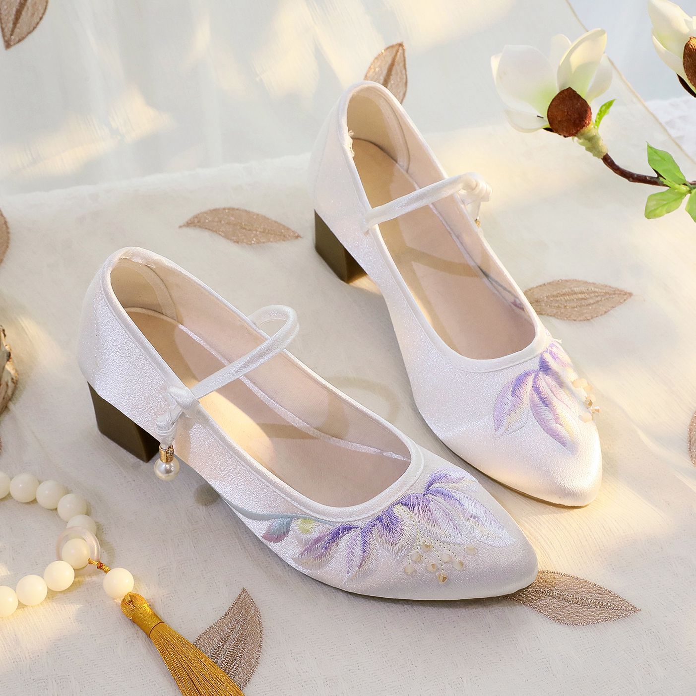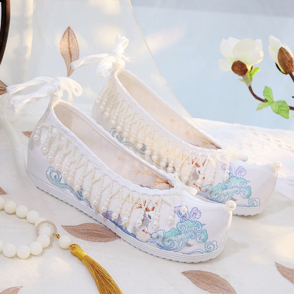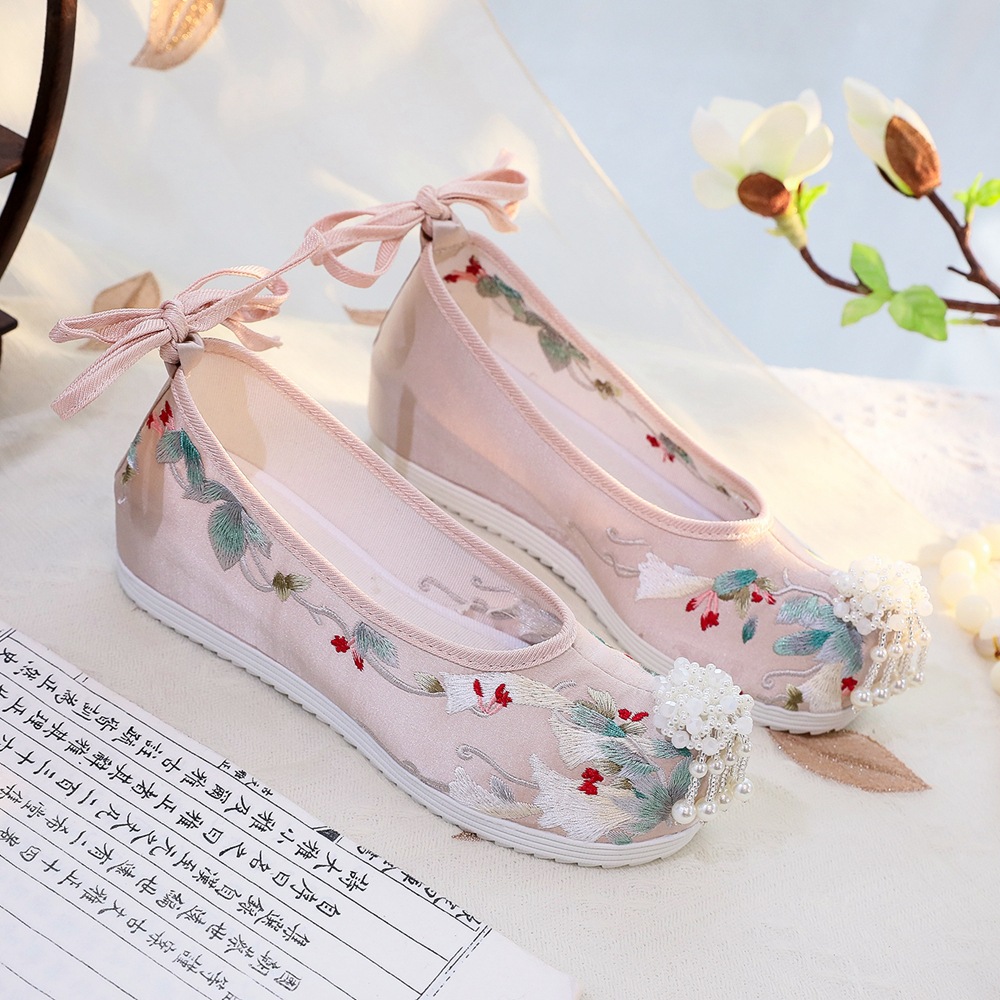 春の新型風鈴漢服の靴の女性の古風な時代の刺繍の靴の女性の明制の高くなる爆珠の単靴の漢風の布の靴