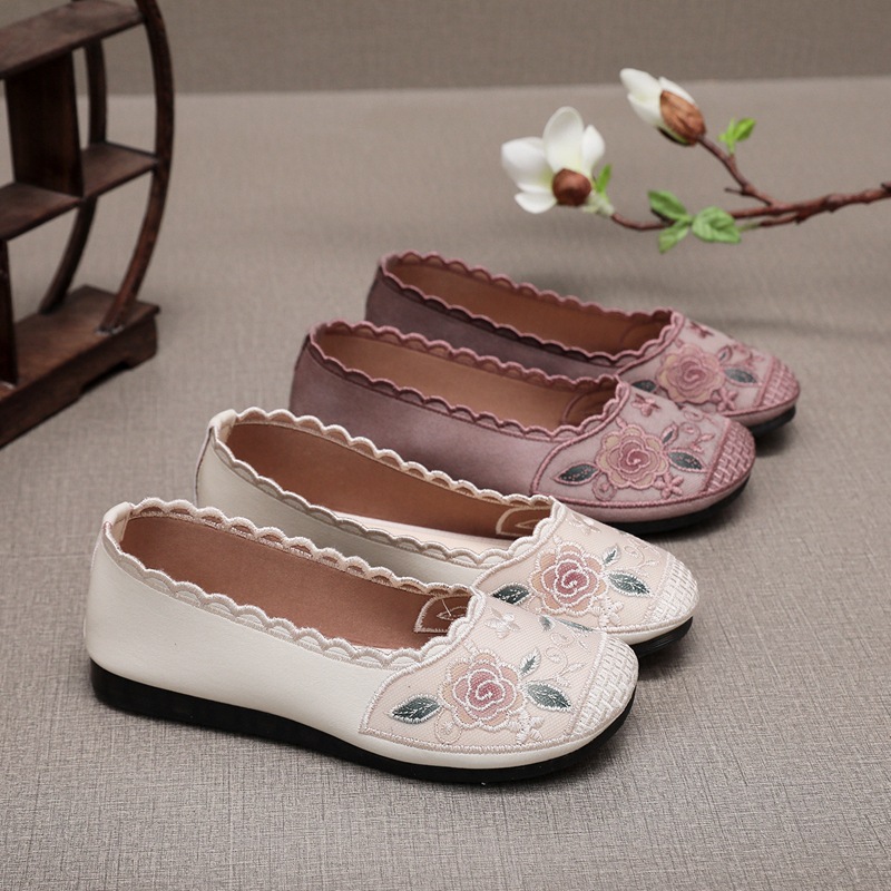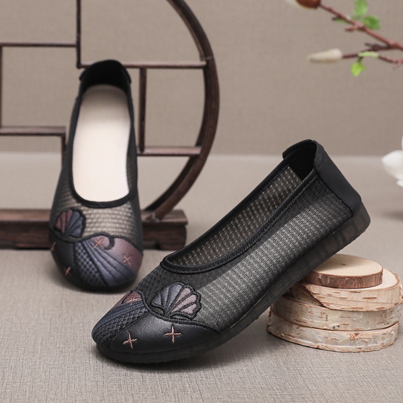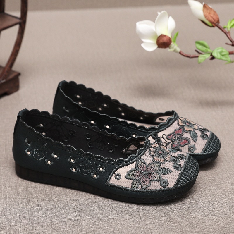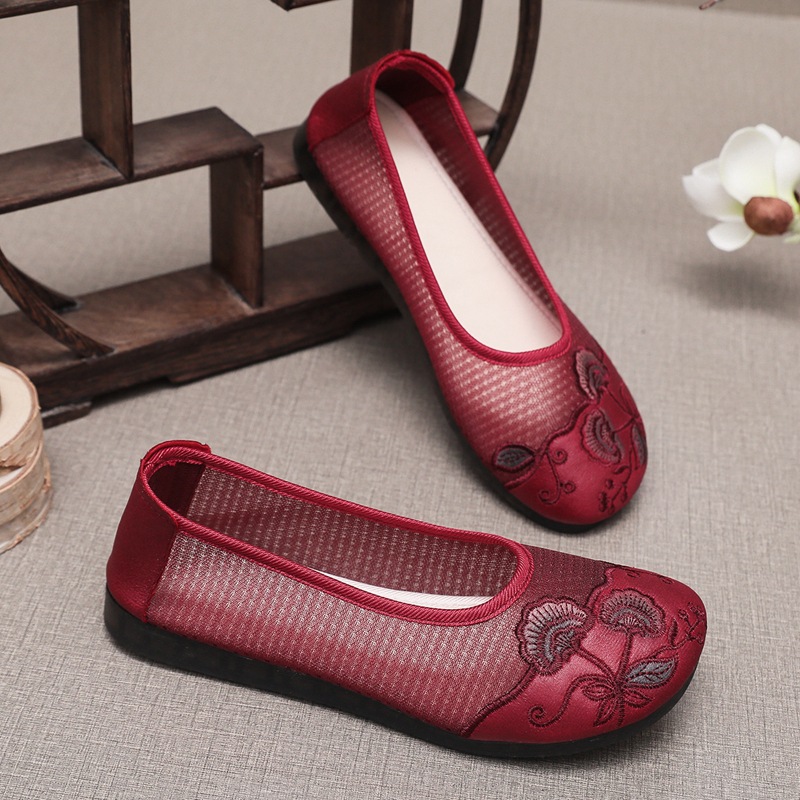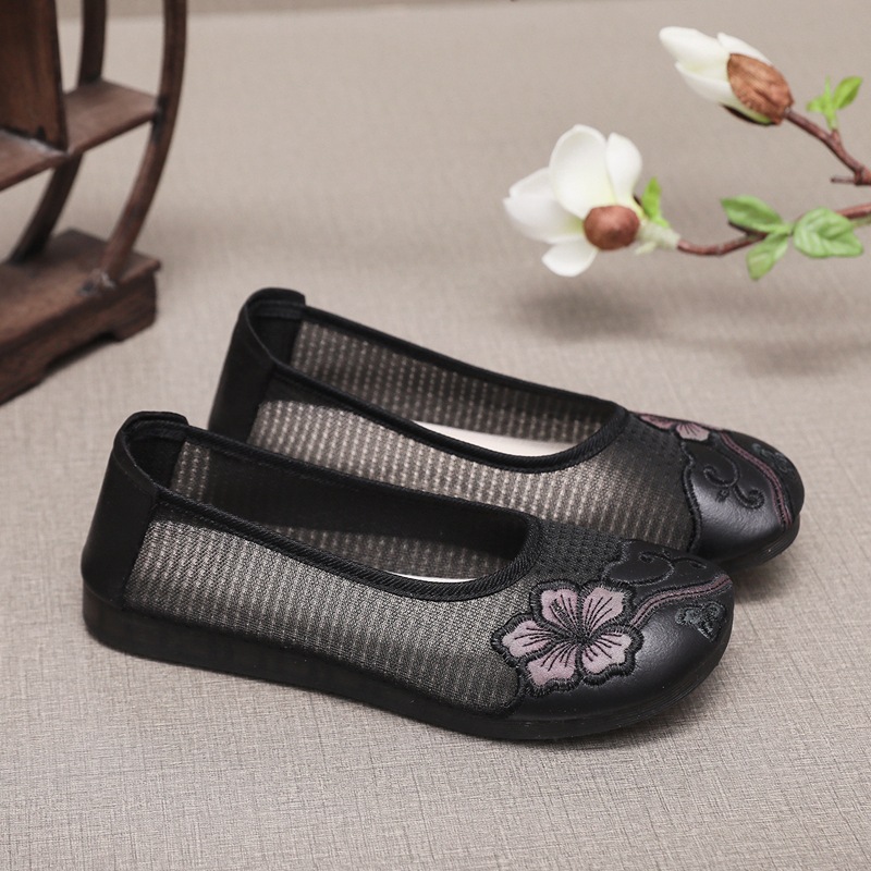 夏の刺繍靴ネット布民族風刺繍古い北京布靴平底軟底母靴中高年ミルク靴