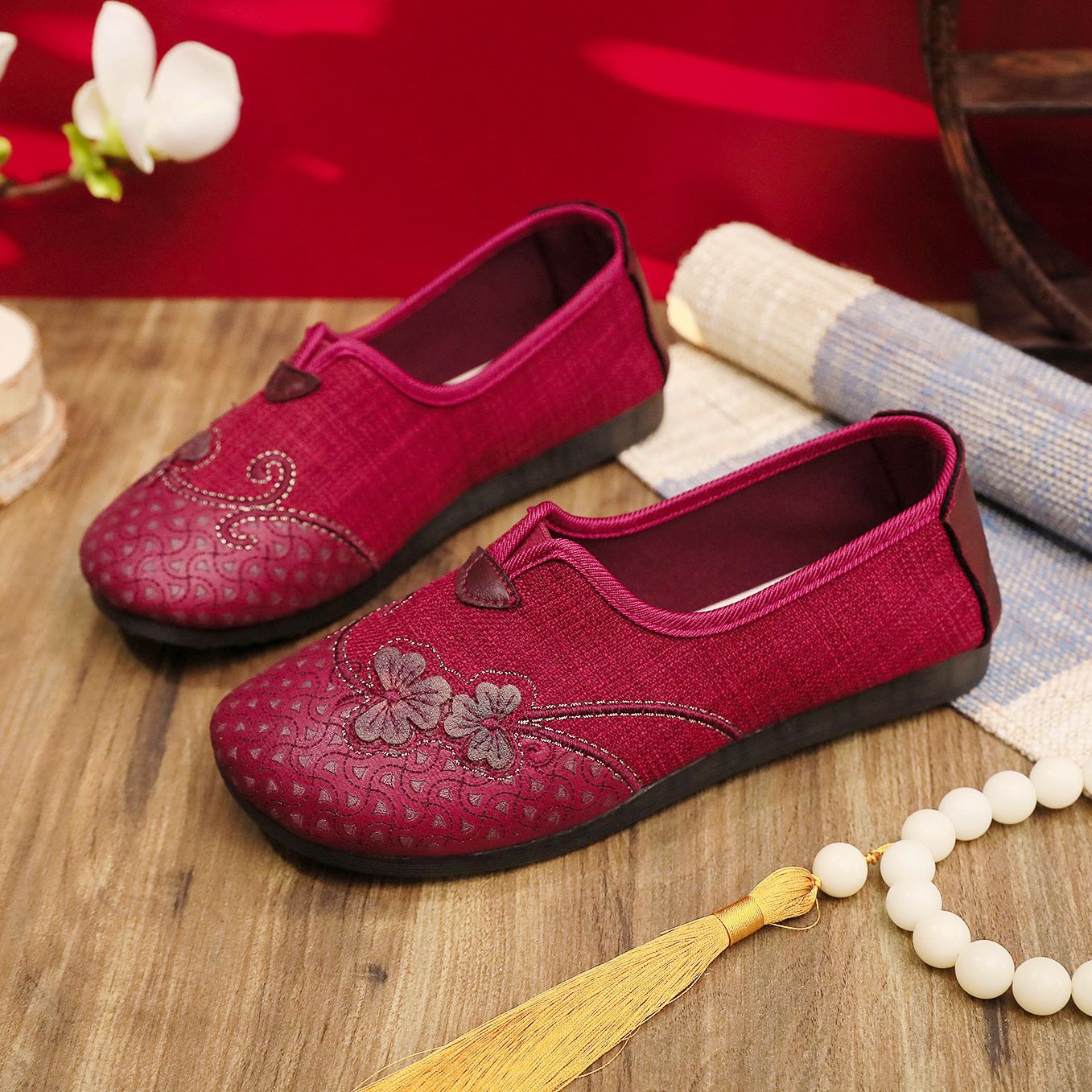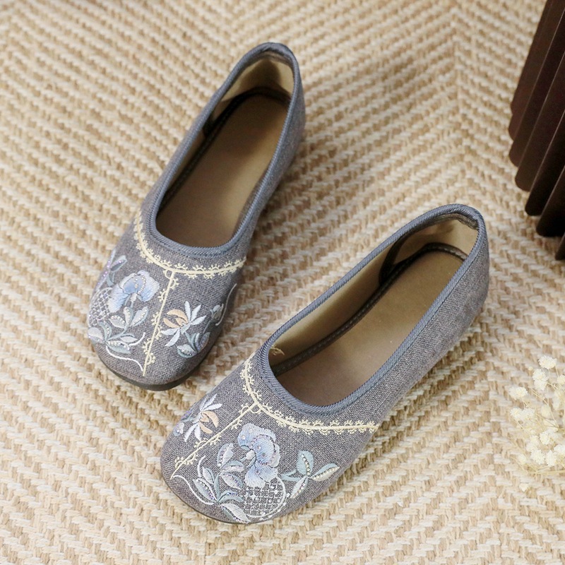 古い北京布靴、女性の春の靴、高齢者の母親、ラウンドトゥのルーズフラットシューズ、通気性のある滑り止めの柔らかい底のおばあちゃんの靴