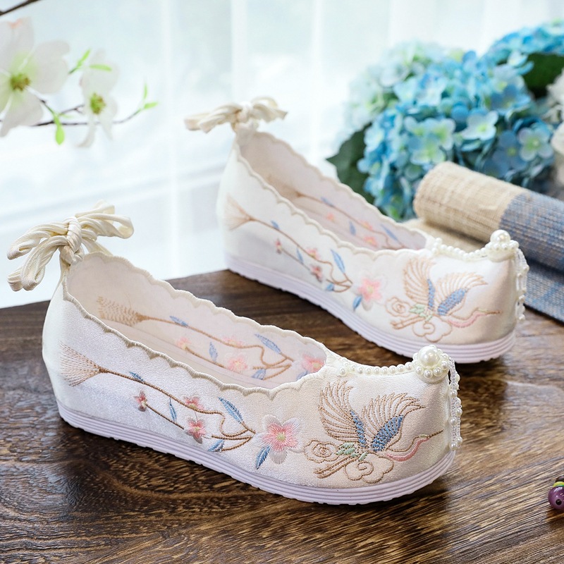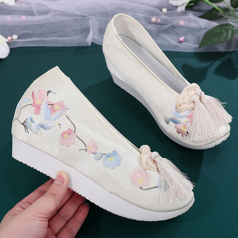 漢服の靴の女性のフリンジの装飾は鳳の玉の蝶の中で高くなって柔らかい底の古風が高くなって頭の弓の靴の女性は時代の布の靴を組み合わせます。