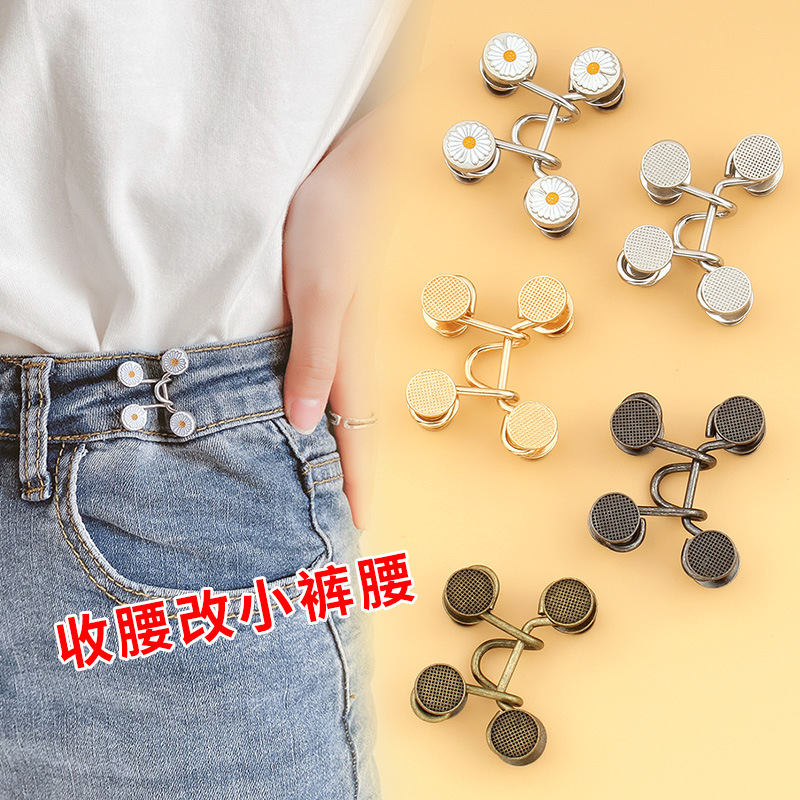 デイジーは腰のボタンを締めて女性のジーンズのズボンのボタンのウエストがゆるんで、神器の金属ボタンの部品を変えました。