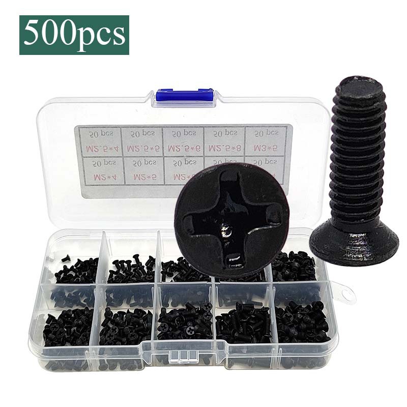 500pcs箱入りKMコンピューターノートブックねじセット十字皿头ネジm2 m2.5m3炭素钢ブラック
