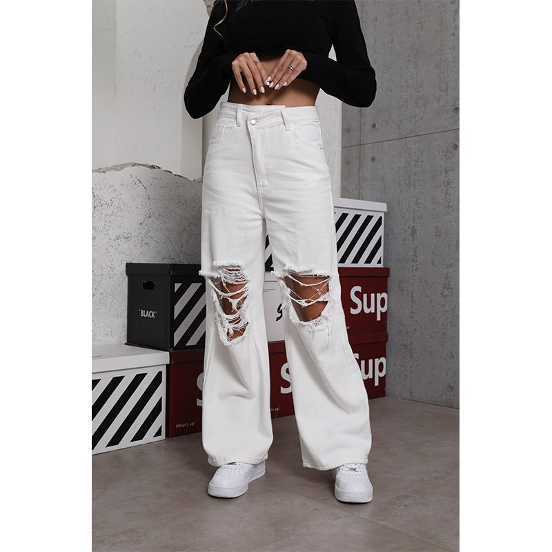 2023春のアマゾンの白いデニムの女性のカジュアルなジーパンのゆったりした街頭の穴を開けたデニムのズボンの女性