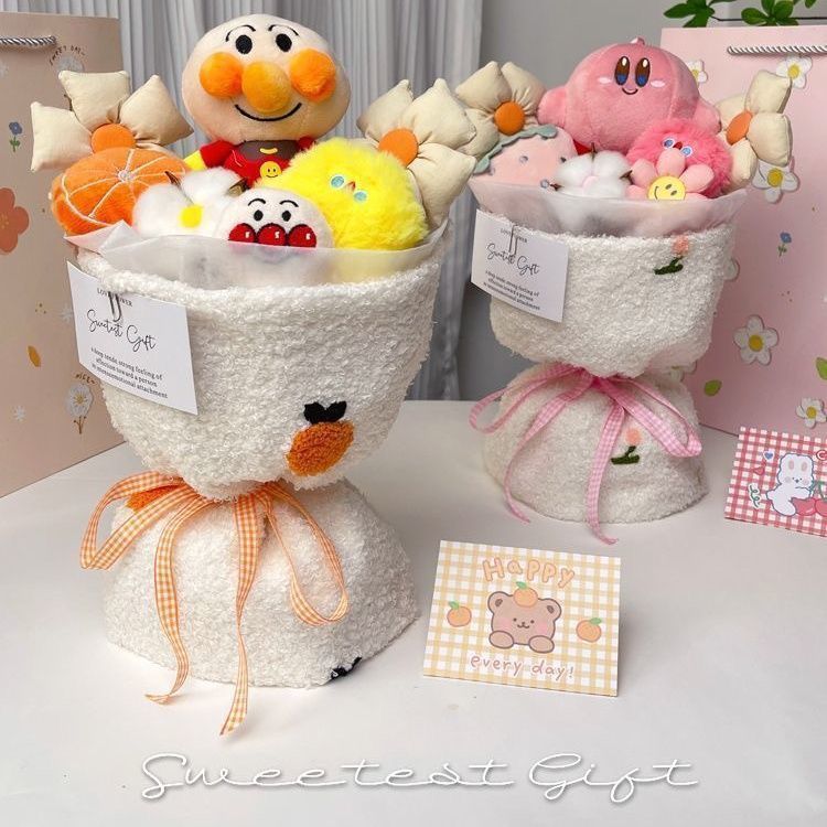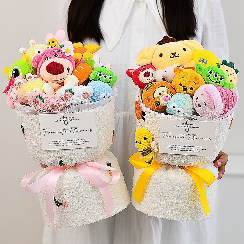 彼女の人形の花束をプレゼントします。女の子のぬいぐるみの誕生日プレゼントです。