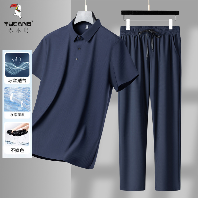 キツツキお父さんスーツ夏薄手半袖ストレッチ中年紳士アイスシルク服カジュアルスポーツ2点セット