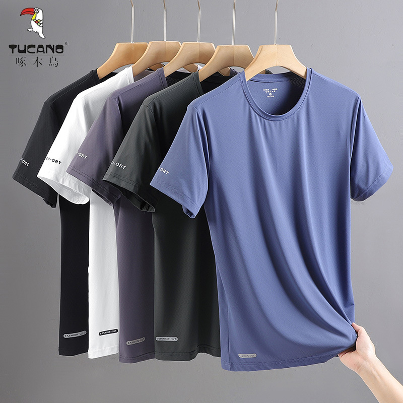 ウッドペッカーアイスシルク半袖Tシャツメンズ夏薄い通気性メッシュスポーツ速乾性トップス軽くカスタマイズ