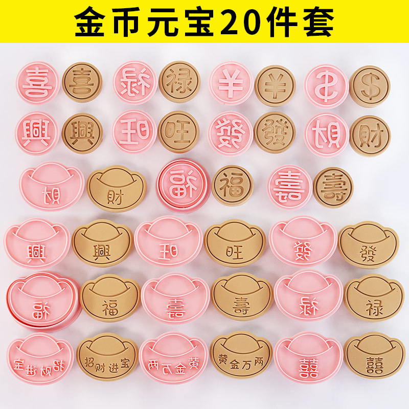 元宝の金貨のビスケットの鋳型の20セットの福の字の寿の字は砂糖のケーキの鋳型をひっくり返します。