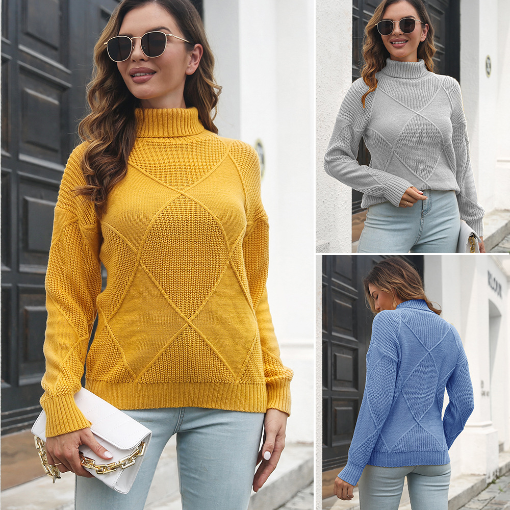 立体菱格高襟セーター女性ゆるい秋冬長袖欧米ニットアマゾンクロスボーダーセーター新商品