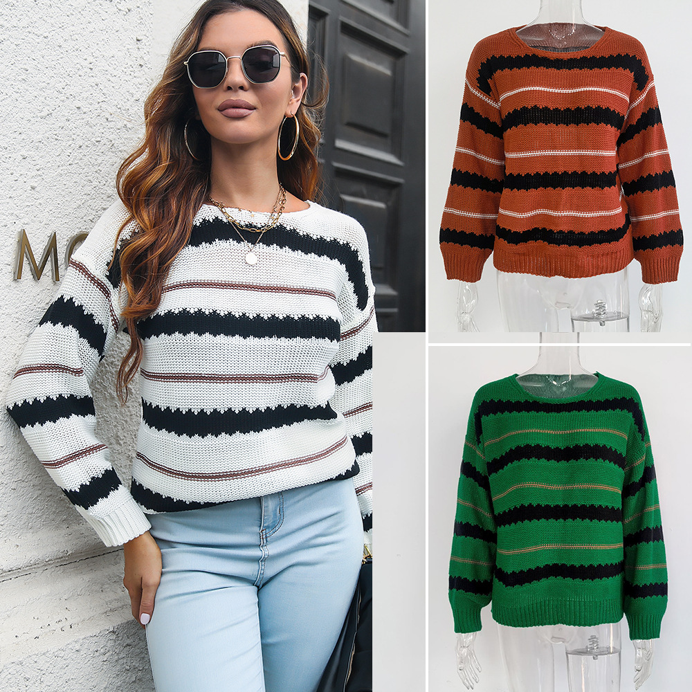 Smt起爆襟ストライプセーター女性ゆるい秋冬長袖欧米ニットinsクロスボーダーセーター新製品
