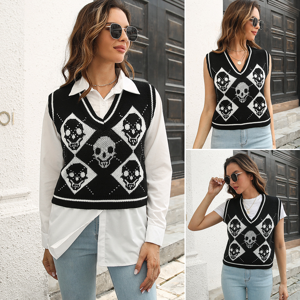 Y2kハロウィーンスカルジャカード菱格ベストセーター女性ベスト秋冬欧米ニットクロスボーダー新作