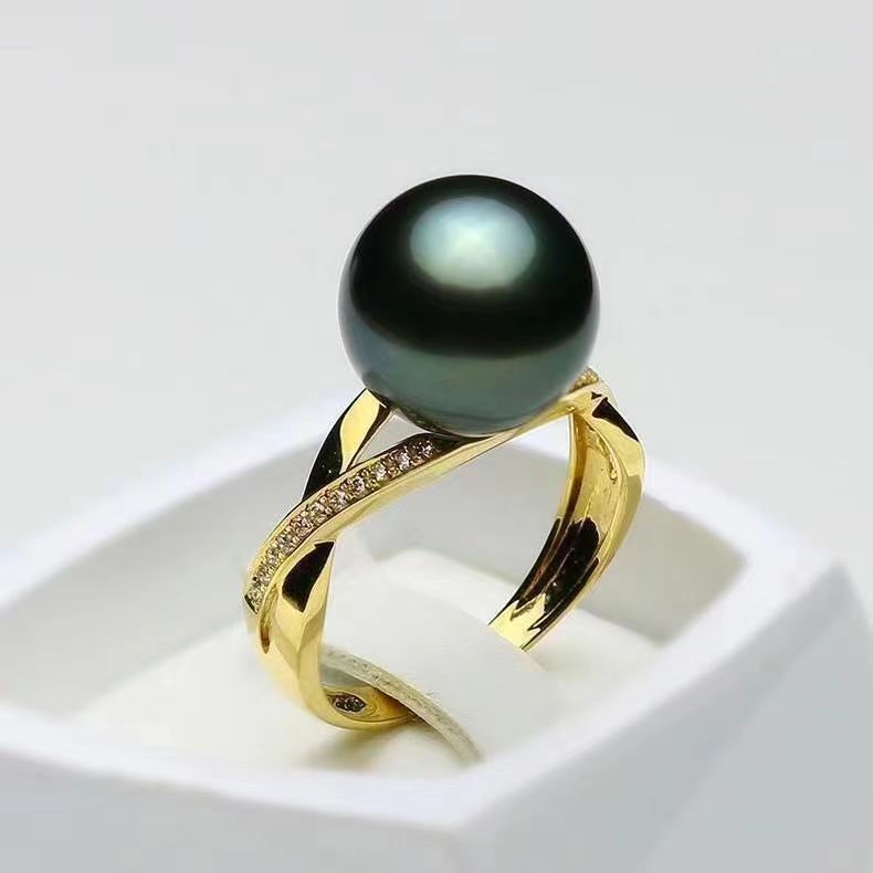 タヒチの緑の真珠の指輪のピーコックの緑の海水の緑の真珠の指輪のファッションの百合の女性の指輪の正円の真珠の指輪