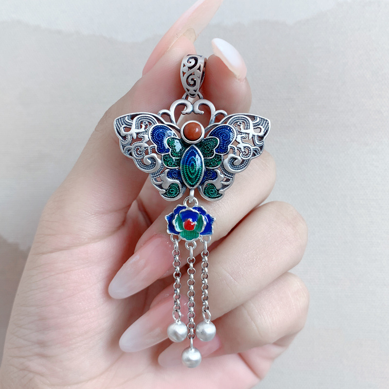 蝶ペンダントエナメル蝶フリンジペンダント手作りレトロ民族風焼青工芸