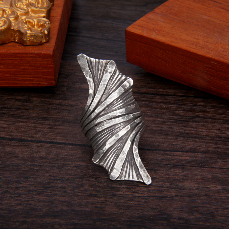 タイのチエンマイの手作りの銀は復古して古いハンマーの紋様の悪魔の翼の指輪をします。