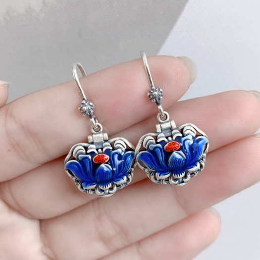 青い蓮のイヤリング 女性用 繊細な焼藍工芸 花が開くジュエリー エスニック風イヤリング 手作り