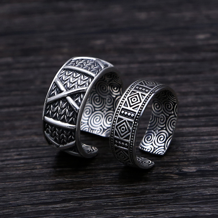メーカー卸売タイシルバー製ジュエリーリング、菱形リング、レトロメンズオープンリング、一点物、卸売対応、ユニーク