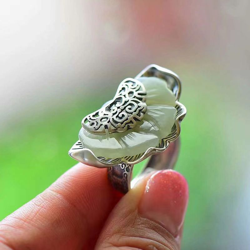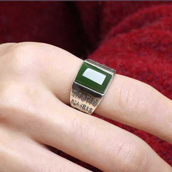 天然和田玉碧玉指輪男潮緑宝石指輪復古泰銀翡翠色鞍活口調節可能