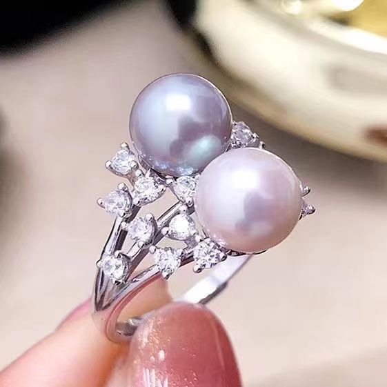 満ドリル気質灰双珠多珠淡水真珠指輪銀女金正円無傷銀灰青高級感